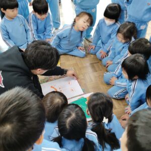 描く前に、節分とはどういう意味が込められているか、どうして豆まきをするのかなど、園長先生に教えてもらい、鬼のお面を作りました。