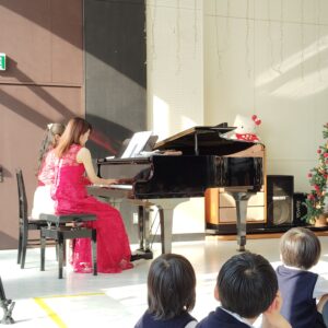 さらにクリスマス会の後には演奏会が開かれ、ピアノ教室の講師・浦先生とピアニスト竹山さんによるピアノの連弾を鑑賞しました。美しい音色が会場いっぱいに広がり、子どもたちも静かに耳を傾けながら豊かな時間を過ごしました。