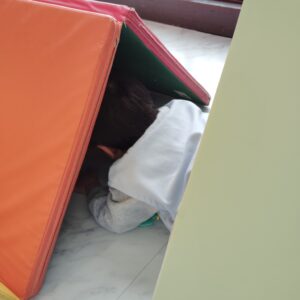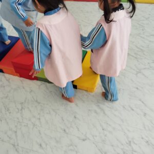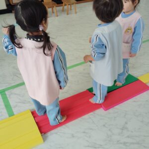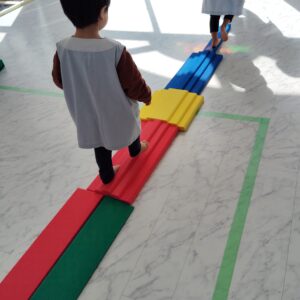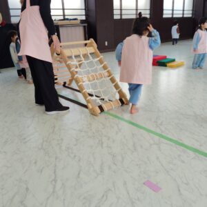 マットやトンネルなど遊具を使いましたが、以前に比べて遊びがダイナミックになっていました。また、最低限のお約束だけを伝えていましたが、遊びの中で必要なルールを友達同士で伝えあうなど、成長を感じる場面が多々ありました。もうすぐ年少さんになるみんなですが、4月からも頼もしい姿を見せてくれそうです!