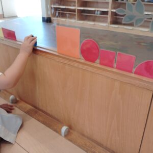 初めは長く繋げて遊んでいましたが、そのうちに四角の下に丸を置いて「くるま」にしたり、半円を上に置いて「ピーポーピーポー」(救急車)と言って遊ぶなど、色板がいろんな形に変身しました。発想が面白く遊びがどんどん展開していきました。使う子によっていろんな形に変化するので、とても面白かったです!