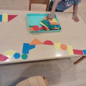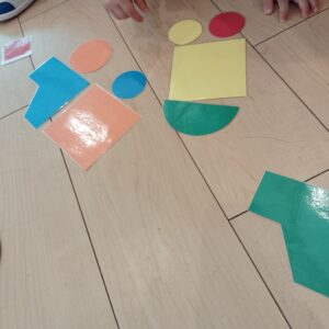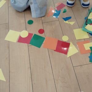 初めは長く繋げて遊んでいましたが、そのうちに四角の下に丸を置いて「くるま」にしたり、半円を上に置いて「ピーポーピーポー」(救急車)と言って遊ぶなど、色板がいろんな形に変身しました。発想が面白く遊びがどんどん展開していきました。使う子によっていろんな形に変化するので、とても面白かったです!