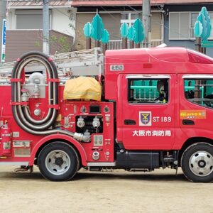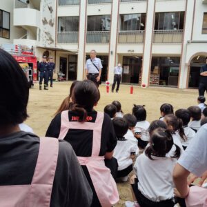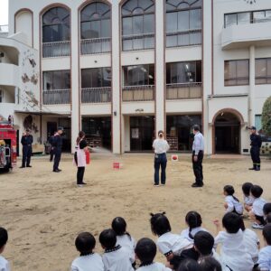 今日は消防訓練でした。毎月おこなっていますが、今回は立ち合い訓練で消防署からも消防士さんが来てくれました。訓練時は真剣な表情で取り組み、火事になった際の逃げ方など教えていただきました。訓練後はみんなで消防車を見せてもらいました。興味深々で消防士さんに質問をしていました!
