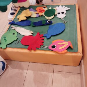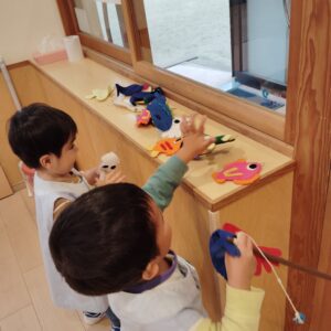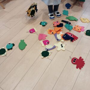 今日は雨だったので、室内で遊びました。フェルトで作った魚釣りがみんな大好き!はじめはお気に入りの魚を見つけて、上手に磁石をくっつけて釣っていましたが、1つずつ釣るのが手間になってきたようで、まとめてたくさん釣りだしました。たくさん釣ると、釣った魚を置く場所をつくり、トランポリンの上に並べだしました。「遊びが展開してきたな~」と感心して見ていると、「ここでお魚焼いてるねん」と言いながら次々に魚を置いていきました。最後には机に見立てた台に魚をのせてたくさんの魚が食卓に並んでいました!1つのおもちゃから様々な発想を膨らませていて、一緒に遊んでいて、こちらもとても楽しくなりました!